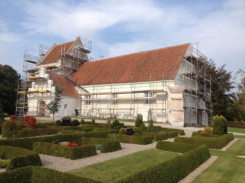 Indvendig kalkning og udbedring af mindre og store revner i hvælv. Reparation af tag og tagfod.